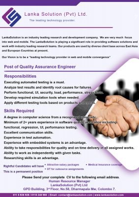 Application deadline date has been passed for this Job.Lanka SolutionsPost Date: November 17, 2021Applications 0Views 297ShareJob Overview Quality Assurance Job Detail Offered SalaryNot Specified Career LevelNot Specified Experience2 Years GenderBoth INDUSTRYIT-Software QualificationBachelor's Degree Shortlist Apply Now Apply with Linkedin Apply with Facebook Never pay anyone for job application test or interview.