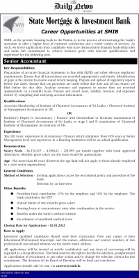 Application deadline date has been passed for this Job.ExploreturePost Date: December 24, 2021Applications 0Views 409ShareJob OverviewSenior AccountantJob Detail Offered SalaryLKR 200,000 - LKR 250,000 Career LevelNot Specified ExperienceMore than 5 Years GenderBoth INDUSTRYAccountancy, Banking and Finance QualificationProfessional Certificate Shortlist Apply Now Apply with Linkedin Apply with Facebook Never pay anyone for job application test or interview.Related Jobs (1) Finance Manager on December 15, 2025 Full-Time